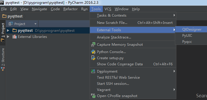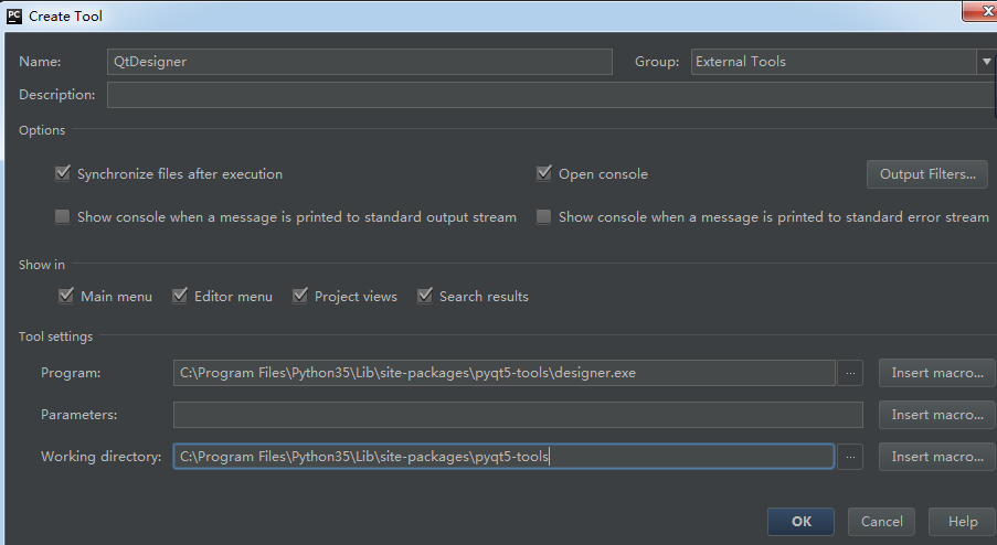 4,添加QtDesigner,exe的路径在安装目录下C:\Program Files\Python35\Lib\site-packages\pyqt5-tools\designer.exe