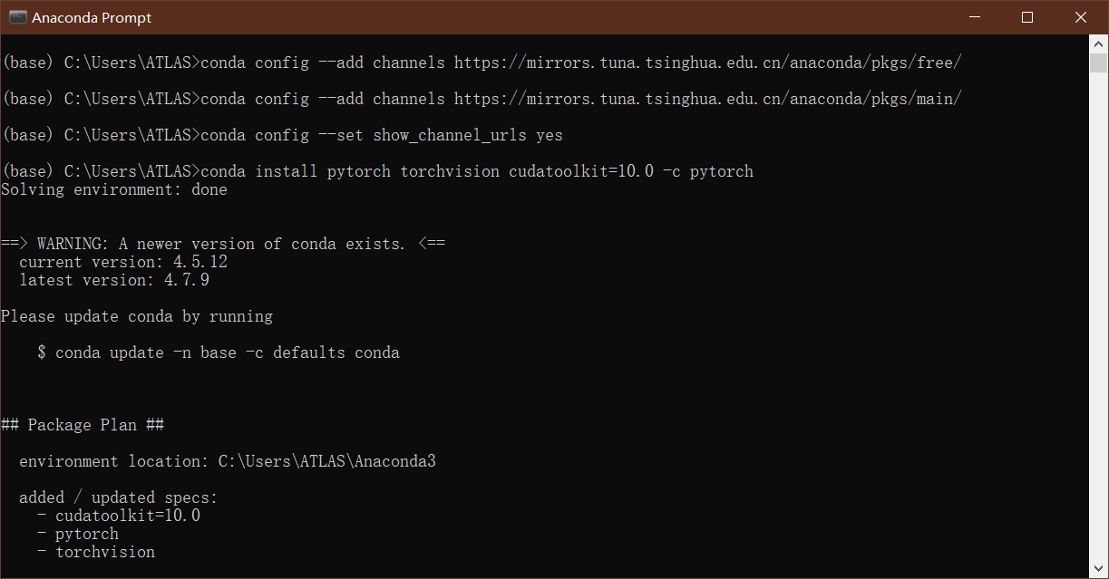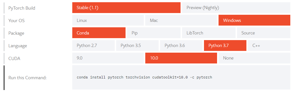 conda install pytorch torchvision cudatoolkit=10.0 -c pytorch