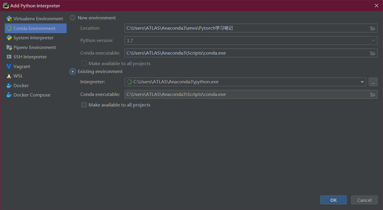 然后在Conda Environment中选择Existing environment