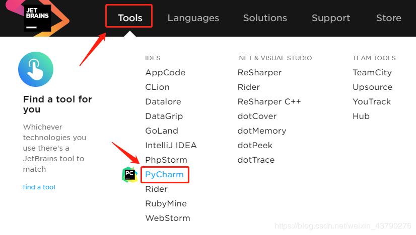 2.进入官网后,点击Tools,然后在下拉菜单中点击PyCharm,进入Pycharm下载页面