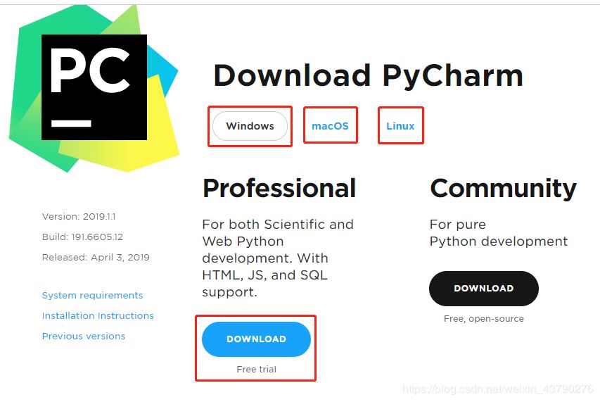 4.在这个页面可以看到PyCharm分为Windows,macOS和Linux三种操作系统,我们选择Windows,并且还分Peofessional(专业版)和Community(社区版),我们选择专业版,选择完成,点击对应的DOWNLOAD(下载)