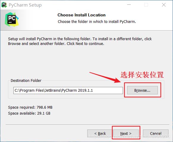 2.PyCharm默认的安装位置为:C:\Program Files\JetBrains\PyCharm 2019.1.1,可以点击Browse选择安装位置,也可以保持默认,自己选择安装路径时,注意路径中最好不要有中文,如果系统里有固态硬盘,则可以将PyCharm安装在固态硬盘里,那样启动速度会快很多