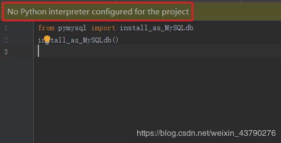 3.此时在PyCharm里面可以开始编写代码了,但是我们会看到编辑框上方提示No Python interpreter...,说明我们没有为PyCharm配置Python解释器,也就是需要配置执行代码的Python解释器,配置了才能执行代码.