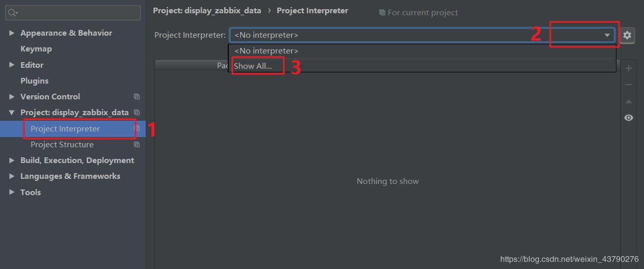 5.在Settings界面点击Project Interpreter,然后点击右边的选择框,再点击Show All添加解释器