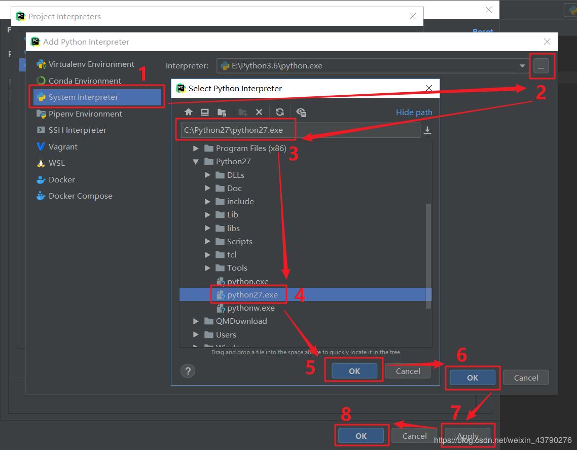 7.然后按照下面的步骤选择Python解释器,找到Python2.7的安装路径,点击将Python2.7添加到解释器中,然后按照相同的方法到Python3.7的安装路径将Python3.7也添加到解释器中