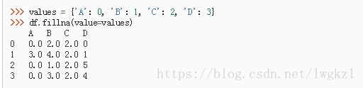 DataFrame.fillna(value=None, method=None, axis=None, inplace=False, limit=None, downcast=None, **kwargs)