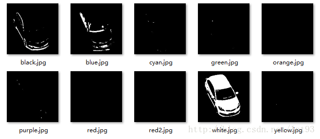 2)、可见使用白色分量过滤背景后,出现车辆的轮廓,因此,能够计算白色区域的面积,最大的则为该物体颜色