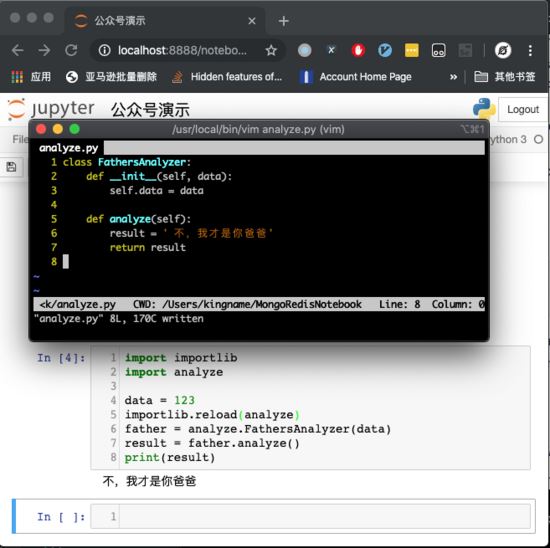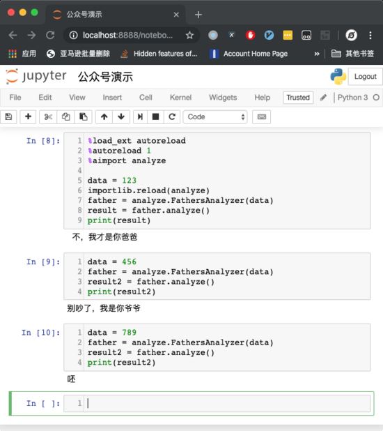 %load_ext autoreload %autoreload 1 %aimport analyze data = 123 importlib.reload(analyze) father = analyze.FathersAnalyzer(data) result = father.analyze() print(result)