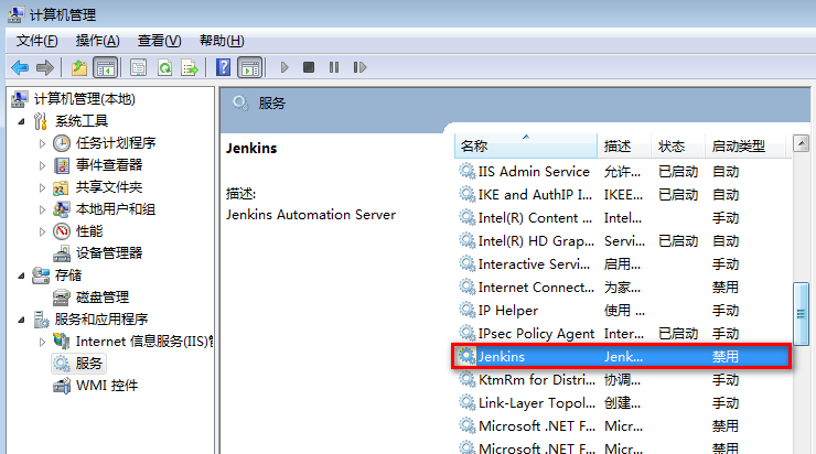 5.配置完成后,为了启动selenium驱动打开浏览器,需要计算机管理服务中配置jekins不以Windows服务的形式在后台运行,关闭其自启动。配置如下: