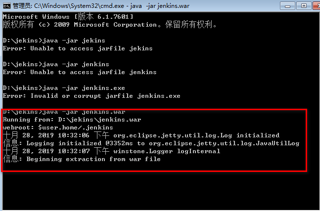 (1)进入到jekins的安装目录,在路径中输入cmd,弹出的cmd窗口中运行jekins.war,如下图: