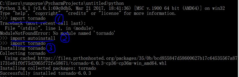我们以 tornado 为例,第一步操作可看出,我们没有装过 tornado,经过第二步操作后,再次导入 tornado 时,程序会帮我们自动下载并安装好 tornado,所以不再报错。
