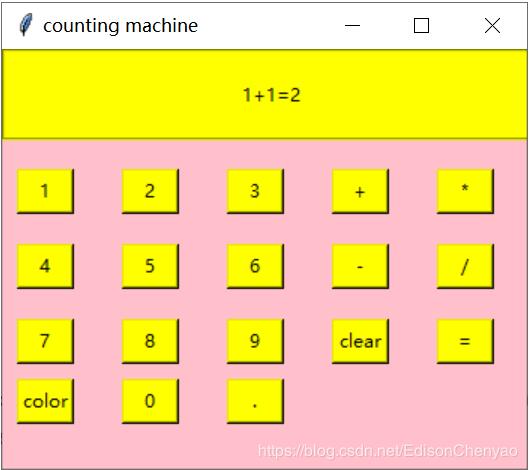 def figure_colorchange(): window.config(bg="pink") btn_value=Button(window,text="color",width=4,command=figure_colorchange,bg='yellow') btn_value.place(x=10,y=220)#改变颜色 window.mainloop()