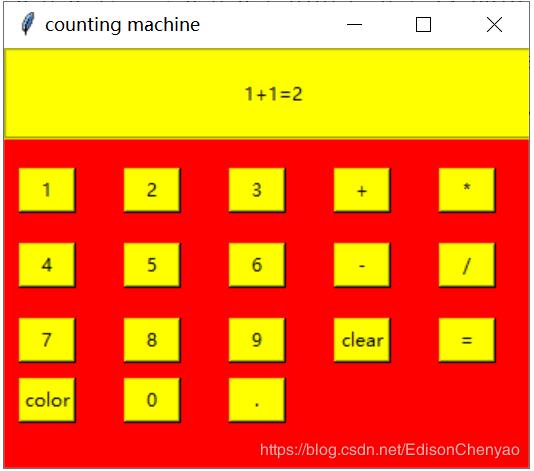 #加法按钮 def figure_addition(): global s s=s+"+" label.config(text=s) btn_add=Button(window,text="+",width=4,command=figure_addition,bg='yellow') btn_add.place(x=220,y=80)#加法按钮 #减法按钮 def figure_subtraction(): global s s=s+"-" label.config(text=s) btn_sub=Button(window,text="-",width=4,command=figure_subtraction,bg='yellow') btn_sub.place(x=220,y=130)#减法按钮 #乘法按钮 def figure_multiplication(): global s s=s+"*" label.config(text=s) btn_multi=Button(window,text="*",width=4,command=figure_multiplication,bg='yellow') btn_multi.place(x=290,y=80)#乘法按钮 #除法按钮 def figure_division(): global s s=s+"/" label.config(text=s) btn_divi=Button(window,text="/",width=4,command=figure_division,bg='yellow') btn_divi.place(x=290,y=130)#除法按钮