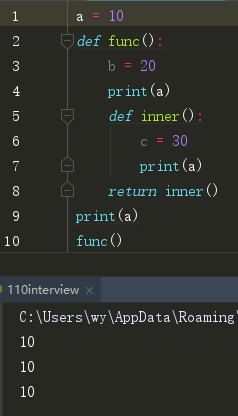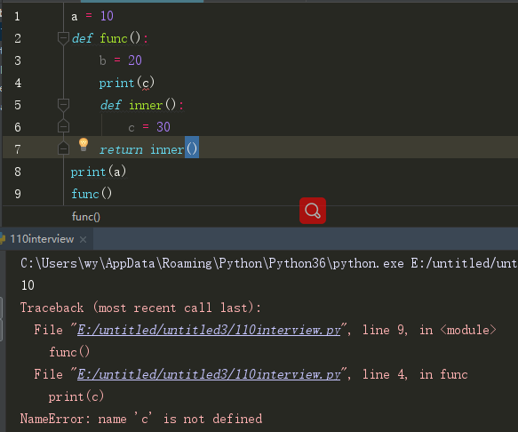 但是func函数不可以调用c,这时候我们把func看做一个整体,那么inner就是在func内部定义的函数,c也就是inner内部的变量