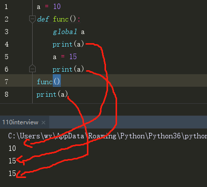 如果我现在想在局部名称空间改变a的值该怎么做呢?这时候就要用到global了