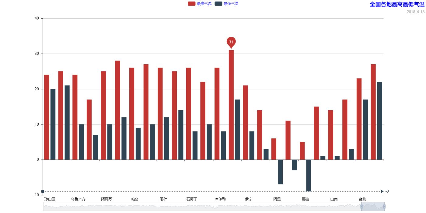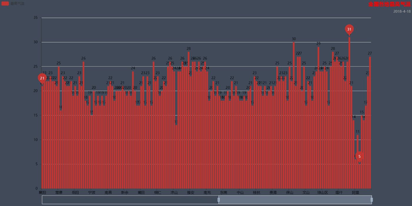 bar.add("最高气温", cities, highs, mark_point=['max'], legend_text_color='red', is_datazoom_show=True)