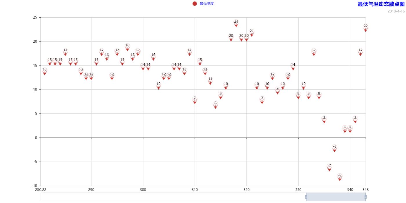 es.add("最低温度", range(0, len(cities)), lows, legend_pos='center', legend_text_color='blue',symbol_size=10, effect_period=3, effect_scale=3.5, symbol='pin',is_datazoom_show=True,is_label_show=True)