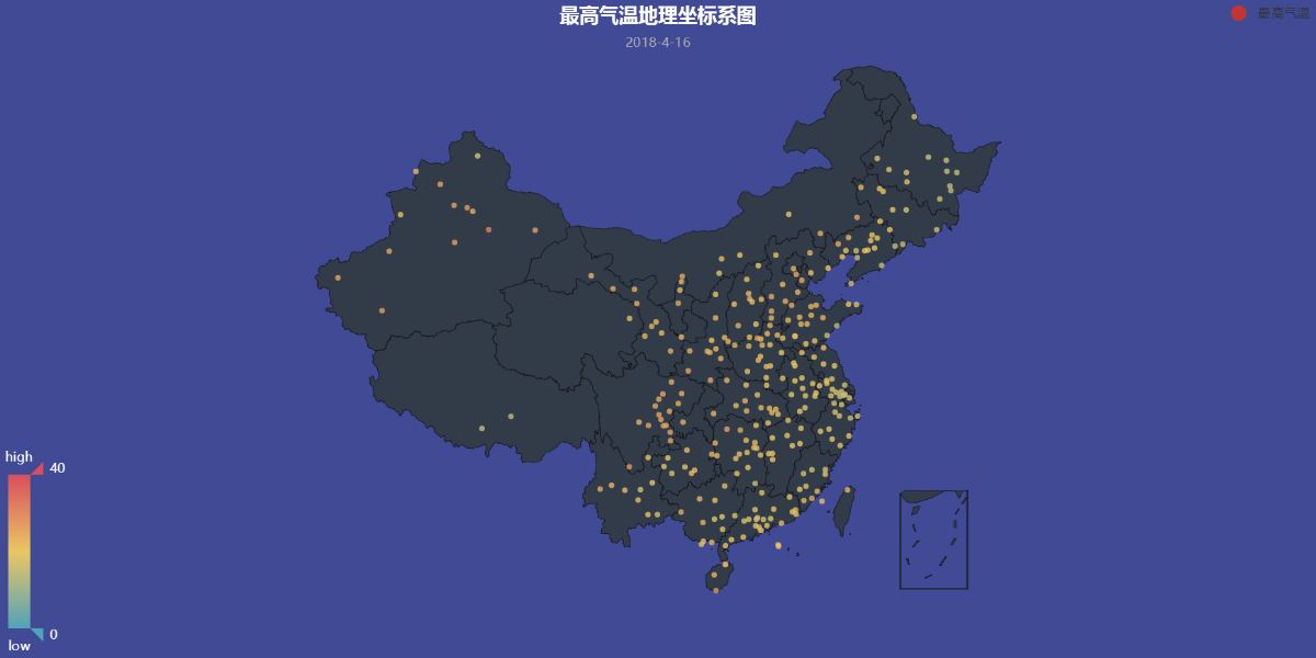 geo = pyecharts.Geo("最高气温地理坐标系图", '2018-4-16', title_color='#fff', title_pos='center', width=1200, height=600, background_color='#404a95')