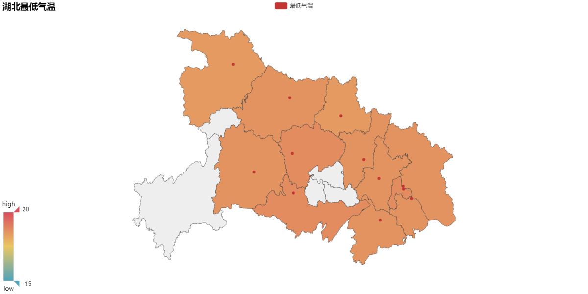 map.add("最低气温", a_city, lows, maptype='湖北', is_visualmap=True, visual_text_color='#000', visual_range= [-15, 20])