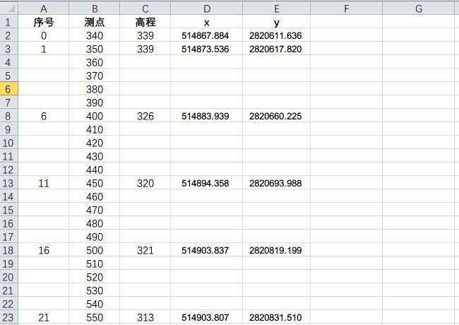 在野外布设700米的测线,点距为10米,用GPS每隔50米测量一个坐标,再把测线的头和为测量一个坐标。现在需使用线性插值的方法求取每两个坐标之间的其他4个点的值。