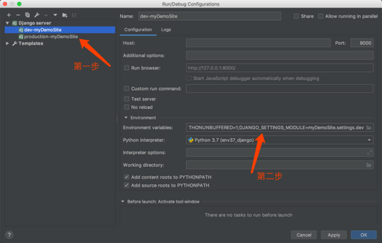 Environment variables 配置。添加或修改 DJANGO_SETTINGS_MODULE 参数为 ProjectName.settings.devproduction 环境下的配置文件,然后重复第1步使用多个配置环境带来的另一个好处就是,我们还可以根据不同的端口号来使用不同的环境。例如我可以在 8000 端口使用开发环境的配置,在 8001 端口使用模拟生产环境的配置,这样子带来的好处是我们在开发的时候可以同时兼顾多个环境下的状态。