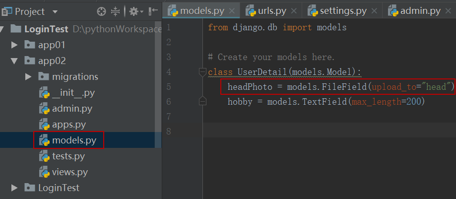 3、在app02/models.py里面, 创建一个模型,用于上传文件