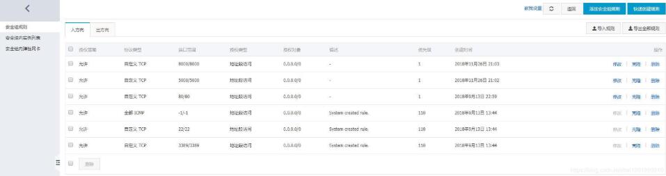 由于我的服务器是阿里云的,所以在阿里云的ECS云服务器控制台中,管理安全组,添加5000和8000端口以便测试。