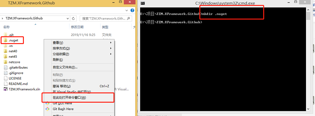 既然是统一管理,生成的包自然是放在同一个文件夹,而不是分散在各个 .proj目录里。这里我们在解决方案所在目录新建一个目录,这样做的目的是方便 bat脚本找到解决方案下面的子项目。比如我这里新建的是 .nuget这个目录,需要注意的是如果目录名称有特殊字符的话不能直接右键新建,需要用命令提示符,直接在解决方案所在目录使用快捷键 SHIFT +右键就能直接打开命令提示符,这样可以省去一大堆 cd的操作。