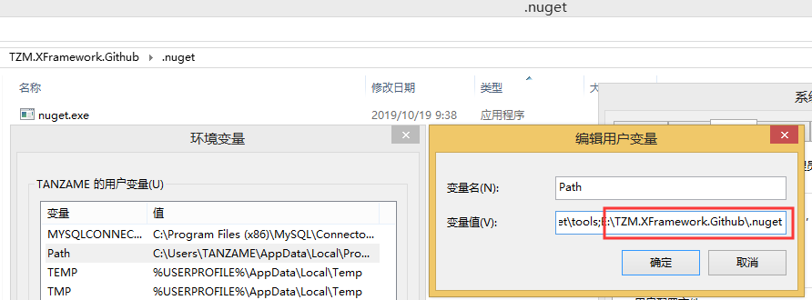 nuget.exe文件。让浏览器将文件保存到选定文件夹。此文件不 是安装程序;如果直接在浏览器中运行,就不会看到任何内容。nuget.exe中放置 PATH 环境变量的位置,这样就可以从任意位置使用 CLI 工具。这里我们把它放在上一步新建的 .nuget文件夹下面,并设置 PATH环境变量。