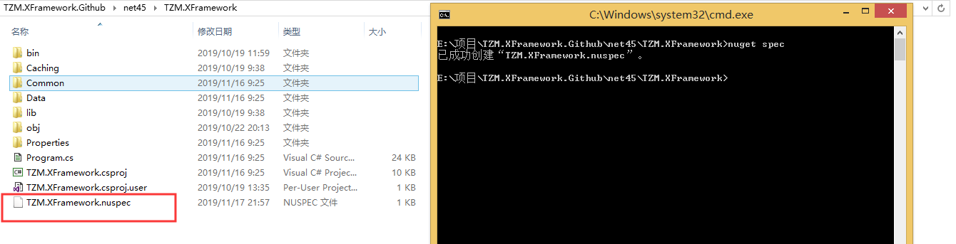 .nuspec文件是包含包元数据的 XML 清单, 此清单同时用于生成包以及为使用者提供信息。这个清单文件我们只需要生成一次,以后都不需要再重新生成。.net Core 和使用sdk 特性.NET Standard 项目不需要 .nuspec 文件,如果是.net Core 和使用sdk 特性.NET Standard 项目则忽略此步骤。转到项目所在目录,SHIFT +右键调出命令提示符,输入 nuget spec命令即可生成我们所需要的包元数据清单。
