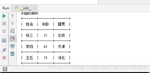 1 #coding:utf-8 2 from prettytable import PrettyTable 3 x= PrettyTable(["姓名", "年龄", "籍贯"]) 4 x.add_row(["张三",32,"北京"]) 5 x.add_row(["李四",45,"天津"]) 6 x.add_row(["王五",28,"河北"]) 7 print(x)