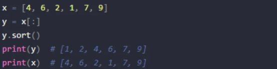 注意:y=x通过分片操作将列表x的元素全部拷贝给y,如果简单的把X赋值给Y:y=x,y和x还是指向同一个列表,并没有产生新的副本。另一种获取已排序的列表副本的方法是使用sorted函数: