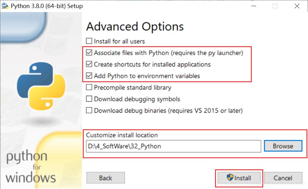 Advanced Options勾选2/3/4项,然后选择安装路径,点击”Install“,等待安装完成