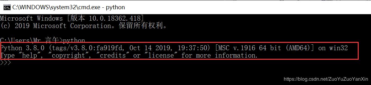 按win+R,输入”cmd“,回车,输入”python“,如果能如下正常回显,则成功。