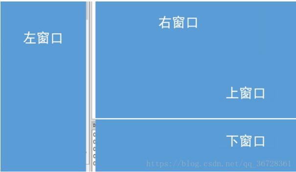 分隔窗口(wx.SplitterWindow)就是将窗口分成两部分,即左右或上下两部分,如下图所示窗口,整体上分为左右两个窗口,右窗口又分为上下两窗口,两个窗口之间的分隔线是可以拖动的,称为“窗框”(sash)。