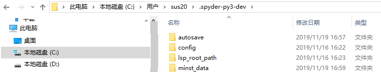 下图是我当前的工作目录环境,因此在C:\Users\sus20\.spyder-py3-dev目录下,建立子目录minist。如下图所示: