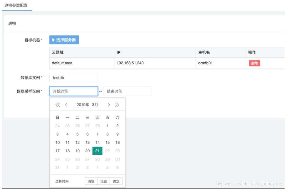 用户首先选择某一业务下对应的目标主机,需要巡检的数据库实例(支持多选),设置数据采样区间(当前时间之前的任意时间段)。
