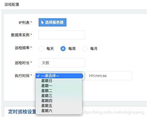 用户可以根据需求设置每天、每周、每月来执行巡检任务。这里举例说明一下每周,用户首先需要配置某业务下面主机、数据库实例、巡检频率、巡检时长(任意天数)、执行时间(每周某一天的某时某分某秒),如下图: