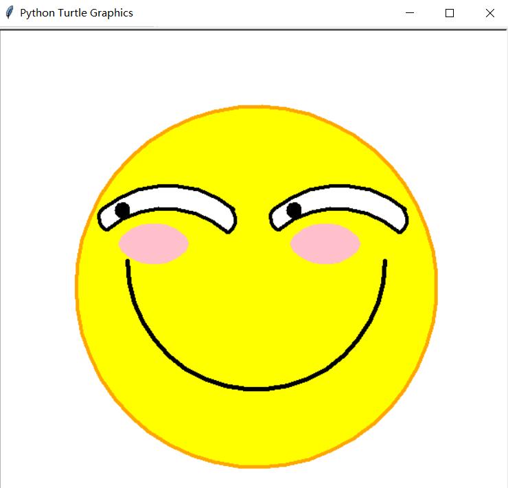 import turtle turtle.setup(600,600,200,200) #fcae turtle.penup() turtle.goto(-210,0) turtle.seth(-90) turtle.pendown() turtle.pencolor(‘orange') turtle.pensize(4) turtle.begin_fill() turtle.circle(210,360) turtle.fillcolor(‘yellow') turtle.end_fill() turtle.pencolor(‘black') #mouth turtle.pensize(5) turtle.penup() turtle.goto(-150,30) turtle.pendown() turtle.seth(-90) turtle.circle(150,180) #left eye turtle.penup() turtle.pensize(4) turtle.goto(-180,90) turtle.pendown() turtle.seth(40) turtle.begin_fill() turtle.circle(-120,80) turtle.penup() turtle.goto(-180,90) turtle.pendown() turtle.seth(-130) turtle.circle(15,110) turtle.seth(40) turtle.circle(-106,83) turtle.seth(30) turtle.circle(18,105) turtle.fillcolor(‘white') turtle.end_fill() #right eye turtle.penup() turtle.goto(20,90) turtle.pendown() turtle.seth(40) turtle.begin_fill() turtle.circle(-120,80) turtle.penup() turtle.goto(20,90) turtle.pendown() turtle.seth(-130) turtle.circle(15,110) turtle.seth(40) turtle.circle(-106,83) turtle.seth(30) turtle.circle(18,105) turtle.fillcolor(‘white') turtle.end_fill() #Eyeball turtle.pensize(2) turtle.penup() turtle.goto(50,95) turtle.pendown() turtle.begin_fill() turtle.circle(8,360) turtle.fillcolor(‘black') turtle.end_fill() turtle.penup() turtle.goto(-150,95) turtle.pendown() turtle.begin_fill() turtle.circle(8,360) turtle.fillcolor(‘black') turtle.end_fill() #Blush turtle.pensize(1) turtle.pencolor(‘pink') turtle.begin_fill() turtle.penup() turtle.goto(-160,50) turtle.pendown() turtle.seth(-90) for i in range(2): for j in range(10): turtle.forward(j) turtle.left(9) for j in range(10,0,-1): turtle.forward(j) turtle.left(9) turtle.fillcolor(‘pink') turtle.end_fill() turtle.pensize(1) turtle.pencolor(‘pink') turtle.begin_fill() turtle.penup() turtle.goto(40,50) turtle.pendown() turtle.seth(-90) for i in range(2): for j in range(10): turtle.forward(j) turtle.left(9) for j in range(10,0,-1): turtle.forward(j) turtle.left(9) turtle.fillcolor(‘pink') turtle.end_fill() turtle.hideturtle() turtle.done()