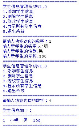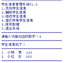 虽然以上代码可以完成上述功能,但是每次调用程序里面的数据全部清除掉了,所以为了更好的模拟现实的学生信息管理系统,我们还需要将上次操作过后的数据保存下来,所以在上面的基础上加上数据存储的代码。