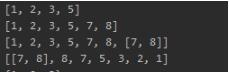 list = [1, 2, 3] list.append(5) print(list) list.extend([7, 8]) # extend是将可迭代对象的元素依次加入列表 print(list) list.append([7, 8]) # append是把传入的参数当成一个元素加入列表 print(list) list.reverse() # 元素翻转,注意不能将这个操作赋给一个变量,此操作是对list本身操作,即list自身发生变化 # l=list.reverse() l为空,没有得到list翻转后的值 print(list)