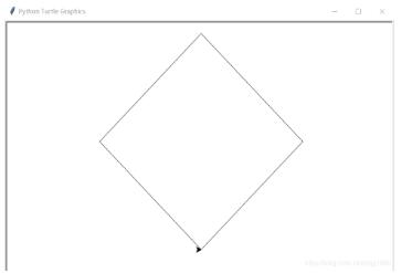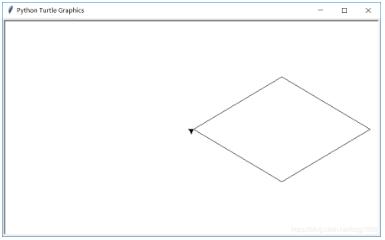 import turtle as t t.right(-45) #起始顶点绝对角度设为正30度 for i in range(4): #画4边,转向4次 t.fd(200) degree = 60*(1+i%2) #其他3顶点右转角度分别为60、120、60度 t.right(degree) t.done()
