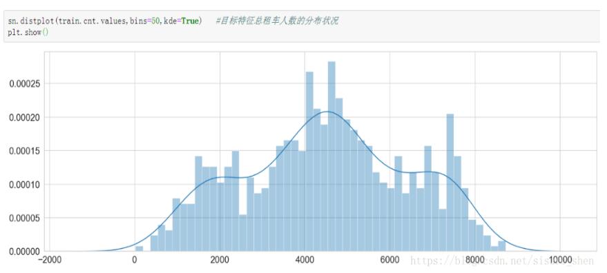 sn.distplot(train.cnt.values,bins=50,kde=True)#连续型特征可使用,bins=50分成50个柱形,kde=True显示核密度线。如果图形的尾巴很特殊,则可能是奇异点(离群点,噪声点),考虑去掉。