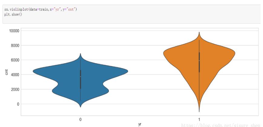 sn.violinplot(data=train[['yr', 'cnt']],x="yr",y="cnt") #显示数据分布及其概率密度,中间的黑色粗条表示四分位数范围,从其延伸的幼细黑线代表 95% 置信区间,而白点则为中位数。