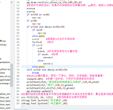 #在循环结束后就是前面乒乓板没有接触到乒乓球后发生的情况,最后是游戏结束的代码,毕竟这游戏靠看得分看成败