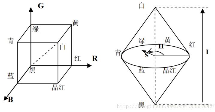 RGB向HSI模型的转换是由一个基于笛卡尔直角坐标系的单位立方体向基于圆柱极坐标的双锥体的转换。基本要求是将RGB中的亮度因素分离,通常将色调和饱和度统称为色度,用来表示颜色的类别与深浅程度。在图中圆锥中间的横截面圆就是色度圆,而圆锥向上或向下延伸的便是亮度分量的表示。 (这里直接借鉴这篇文章:OpenCV+Python--RGB转HSI的实现)