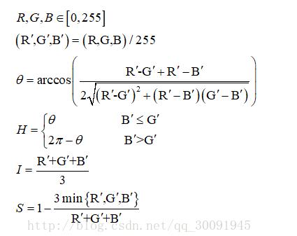 从RGB空间到HSI空间的转换有多种方法,这里仅说明最为经典的几何推导法。RGB转化成HSI的公式为:
