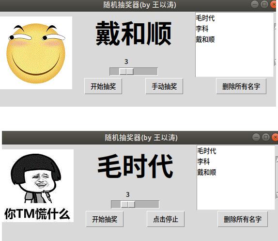 以上这篇python写一个随机点名软件的实例就是小编分享给大家的全部内容了,希望能给大家一个参考,也希望大家多多支持脚本之家。