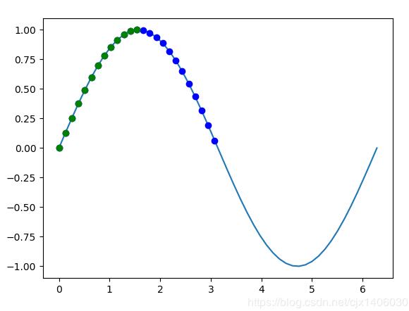 import matplotlib.pyplot as plt import numpy as np a = np.linspace(0, 2 * np.pi, 50) b = np.sin(a) plt.plot(a,b) #生成一个正弦函数图 mask = b >= 0 plt.plot(a[mask], b[mask], 'bo') #符合条件的标注蓝色圆点 mask = (b >= 0) & (a <= np.pi / 2) plt.plot(a[mask], b[mask], 'go') #符合条件的标注绿色圆点 plt.show()