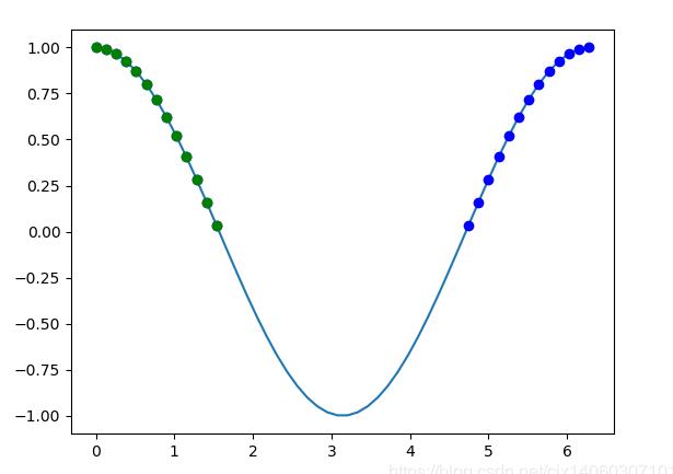 import matplotlib.pyplot as plt import numpy as np a = np.linspace(0, 2 * np.pi, 50) b = np.cos(a) plt.plot(a,b) #生成一个余弦函数图 mask = b >= 0 plt.plot(a[mask], b[mask], 'bo') #符合条件的标注蓝色圆点 mask = (b >= 0) & (a <= np.pi / 2) plt.plot(a[mask], b[mask], 'go') #符合条件的标注绿色圆点 plt.show()